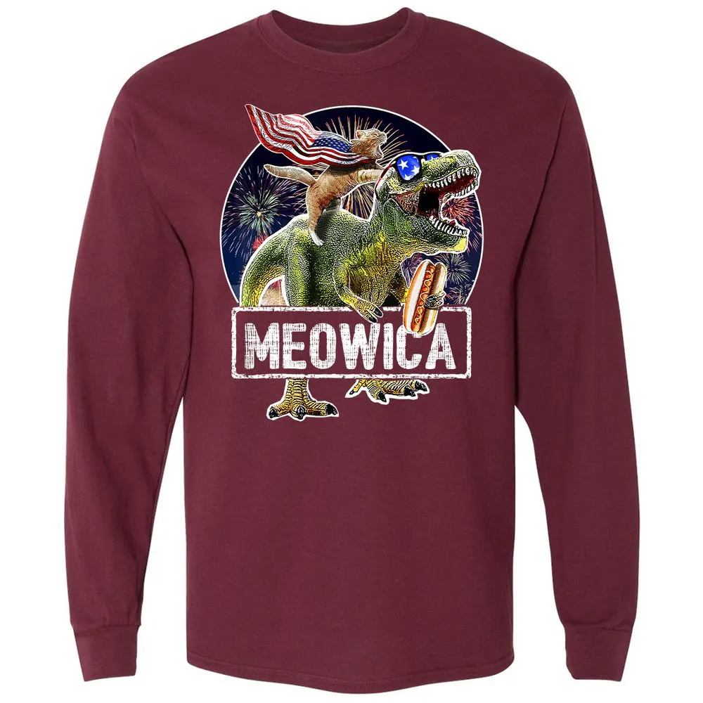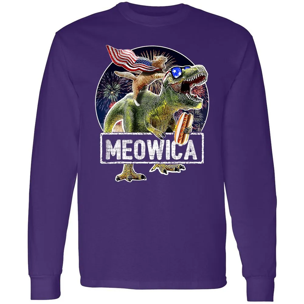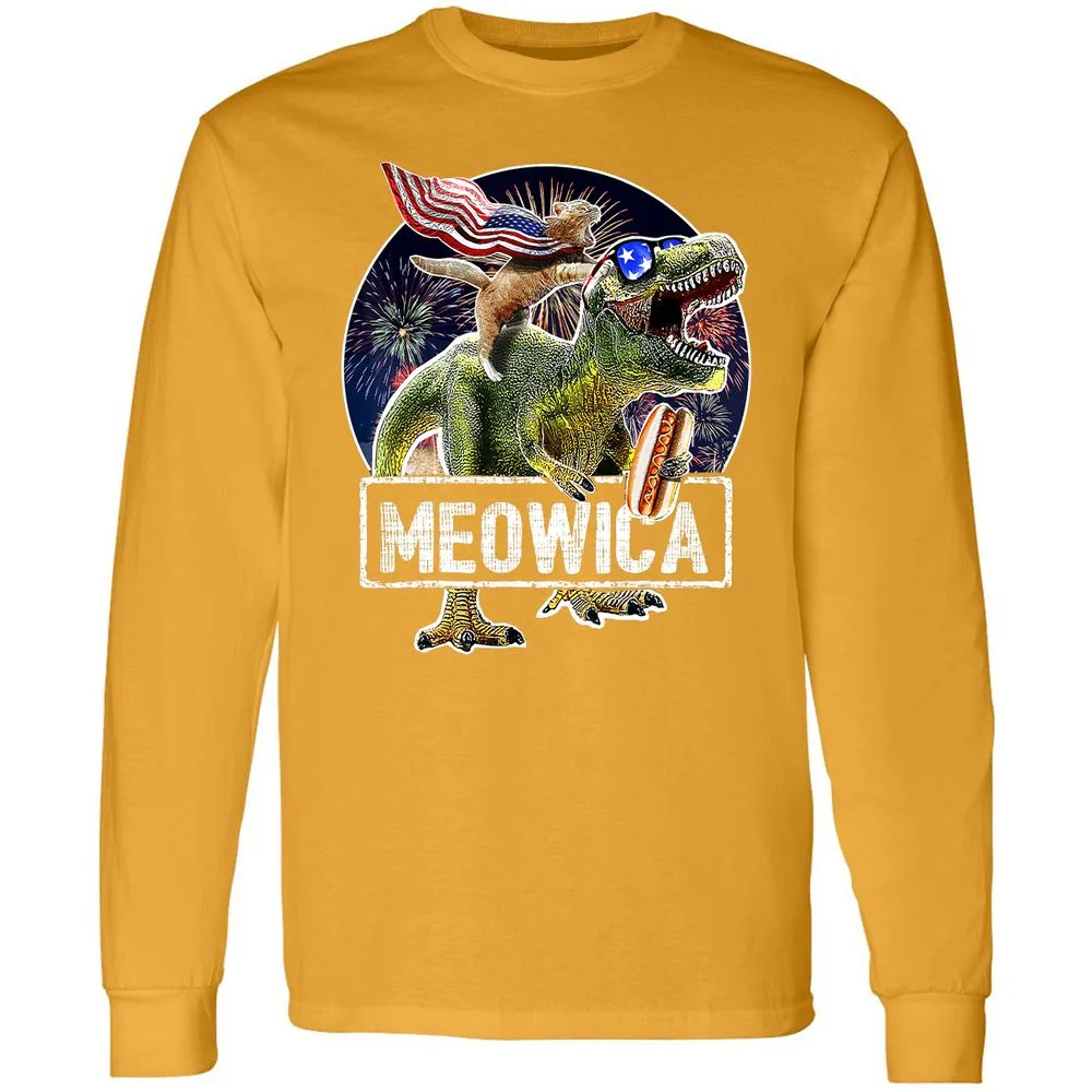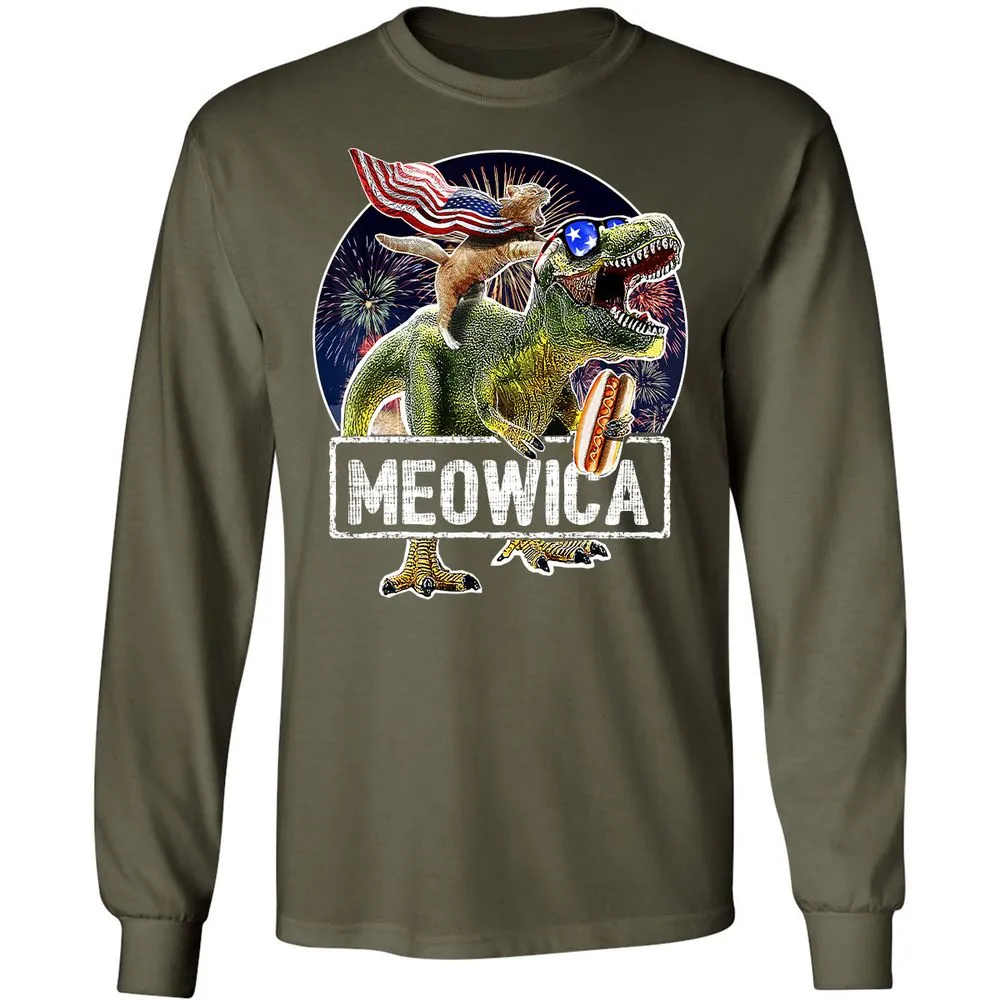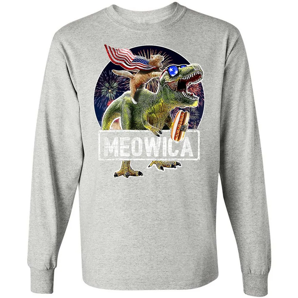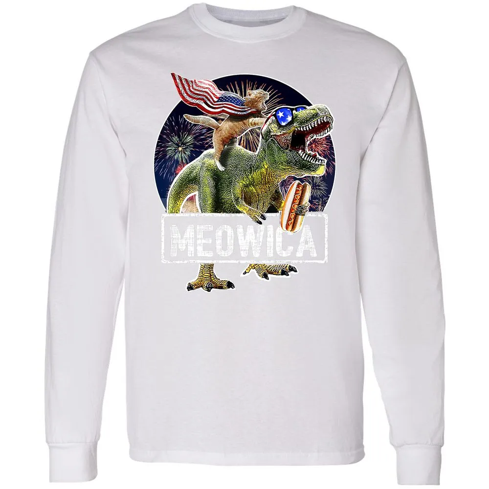 Meowica American Flag Cat T Rex Dinosaur 4th of July Kids Long Sleeve T-Shirt