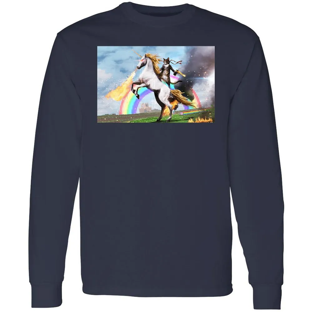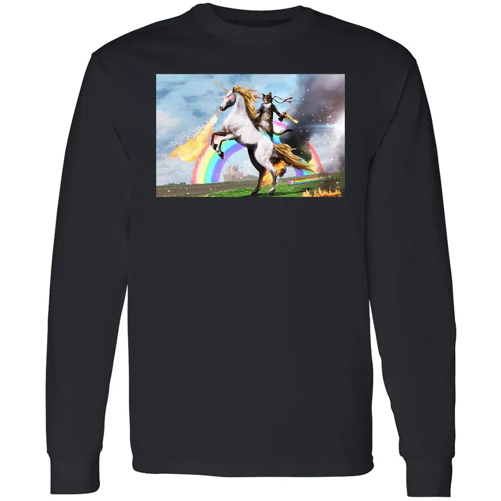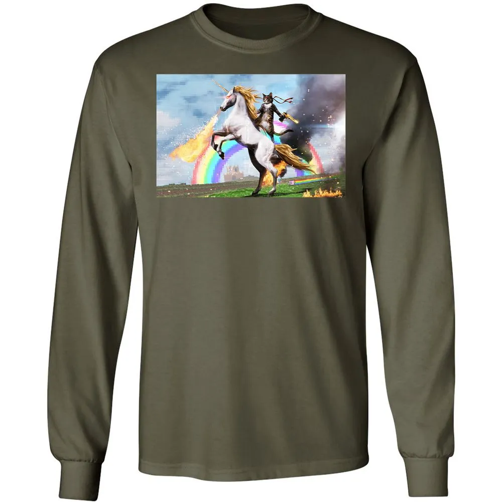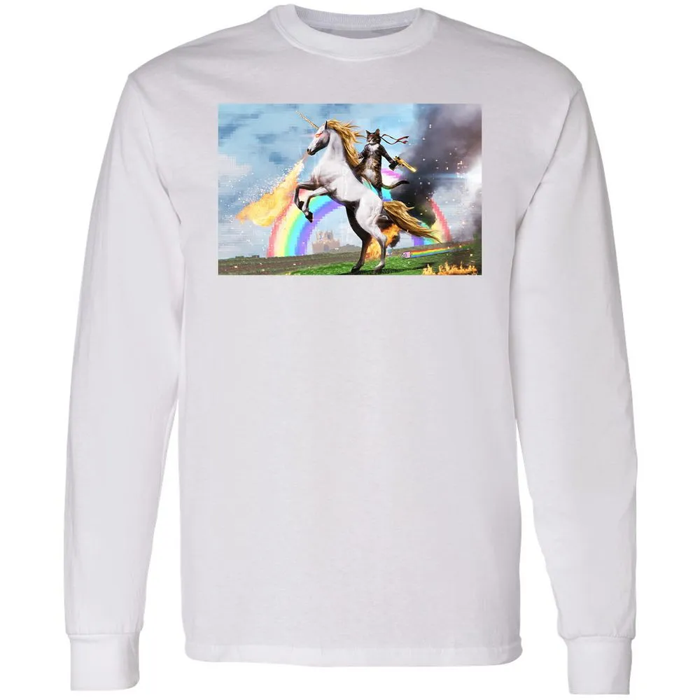 Cat Riding Fire Breathing Unicorn Meme Long Sleeve T-Shirt