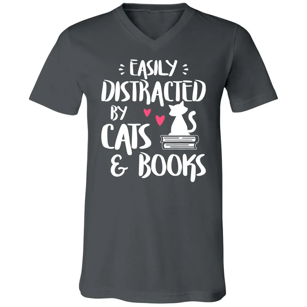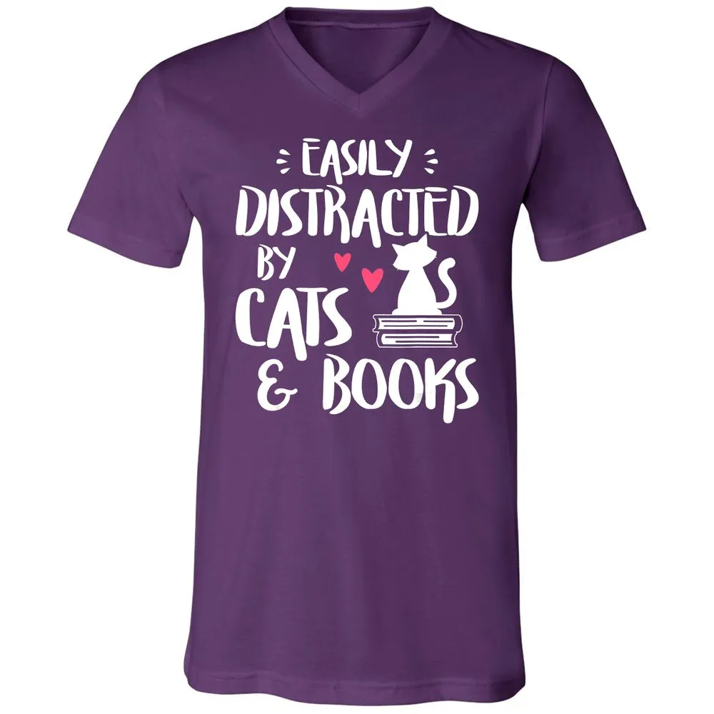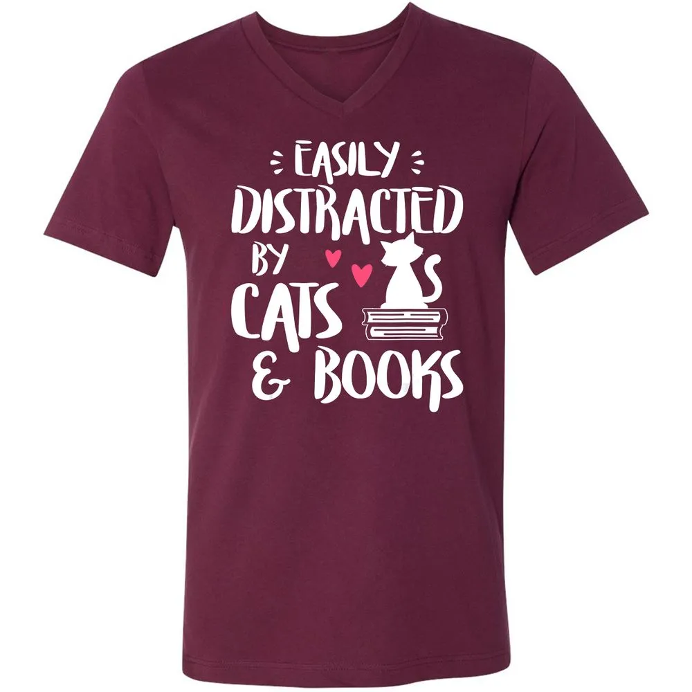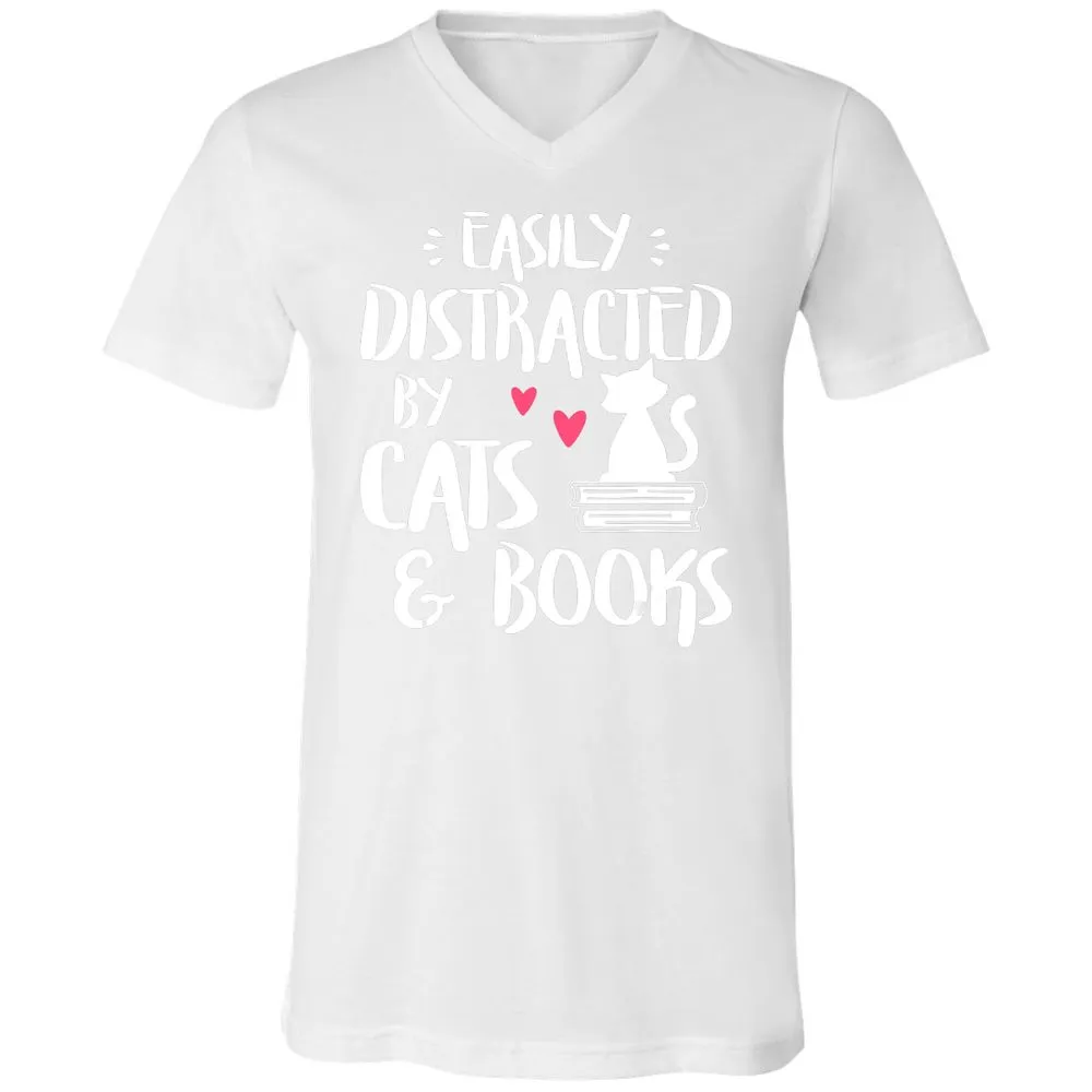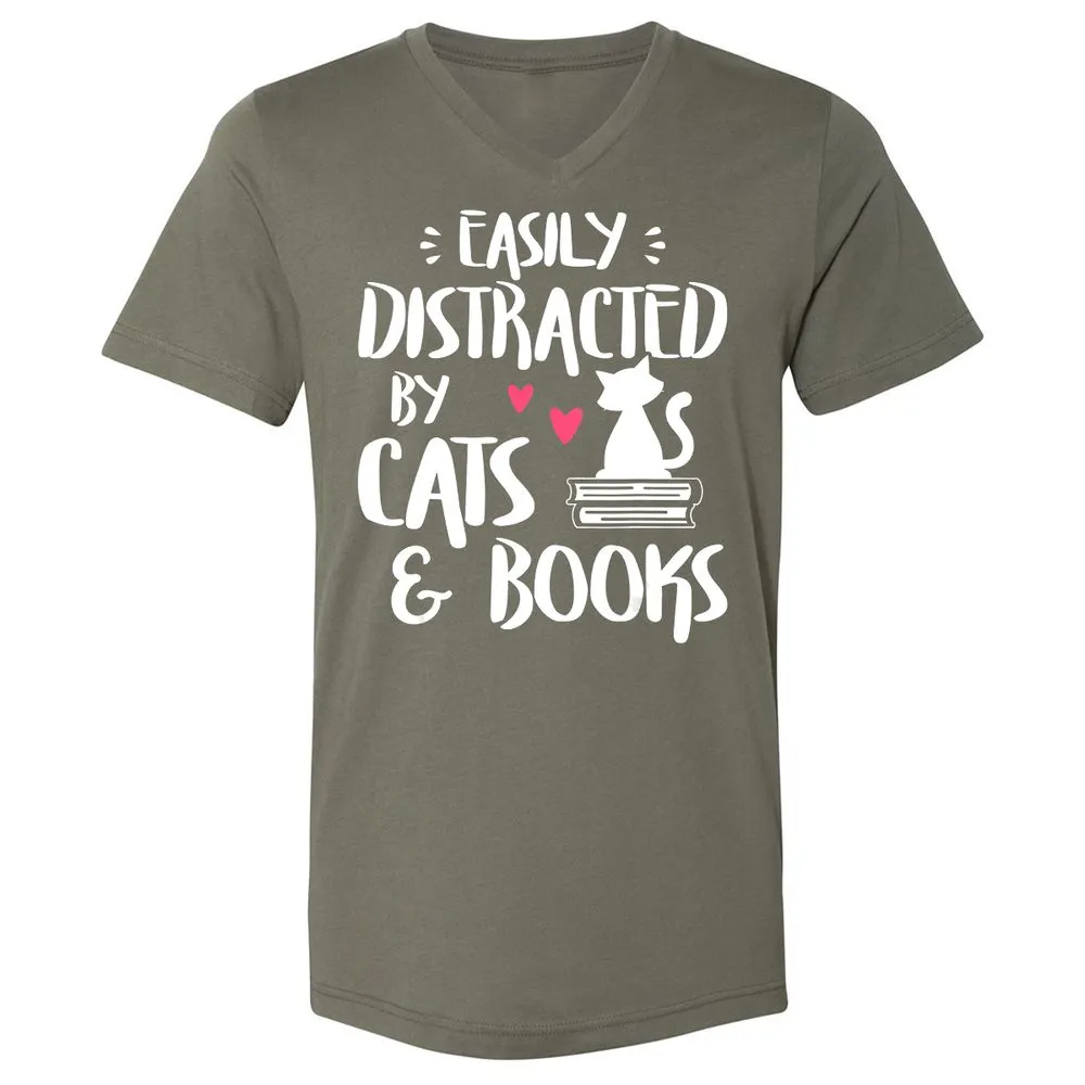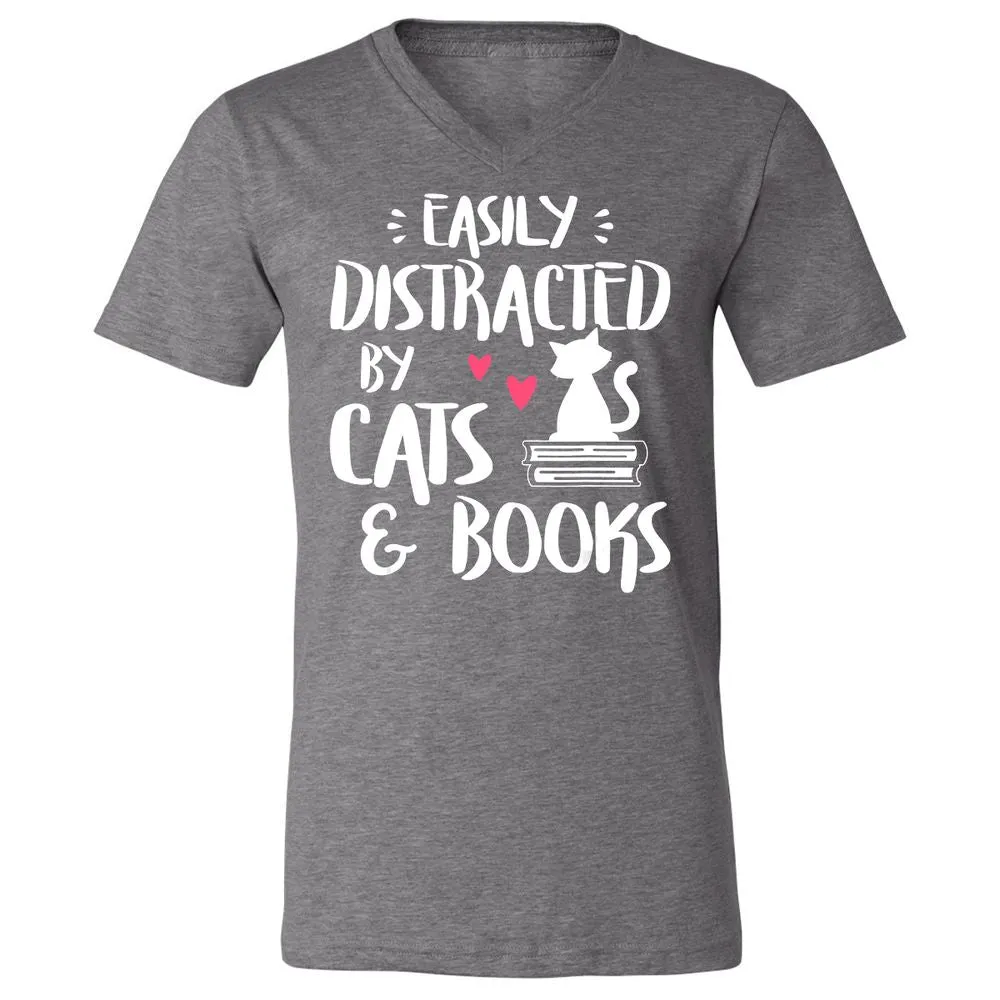 Easily Distracted by Cats and Books Cat & Book Lover Unisex V-Neck T-Shirt